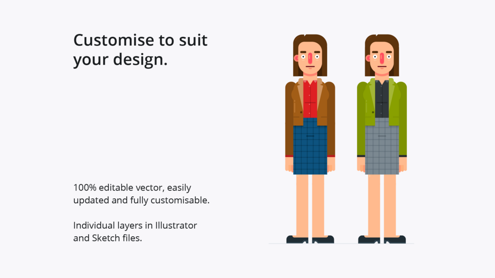 The characters are easily updatable - you may create your own hairstyles, clothes and faces and easily swap them out in animation via the AI file.